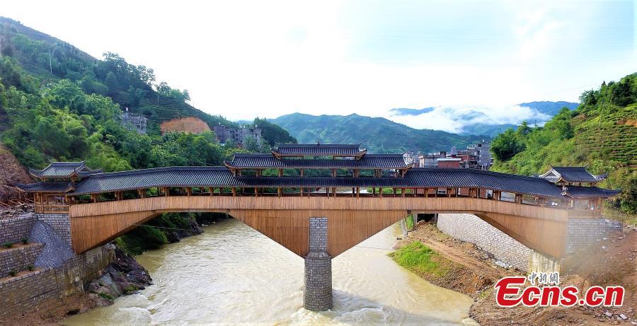 File photo shows the Sanxian wooden-roofed arch bridge in Hexi village of Chunchi town, Zhouning county, Ningde, east China's Fujian Province. (Photo: China News Service/Li Hongyuan)