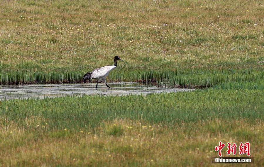 A black-necked crane wanders at Yanglong Wetland Park at Qilian county, Haibei Tibetan Autonomous Prefecture, northwest China's Qinghai Province, Aug. 9, 2022. The black-necked crane is endemic to the Tibetan Plateau. (Photo: China News Service/Jia Tianyong)