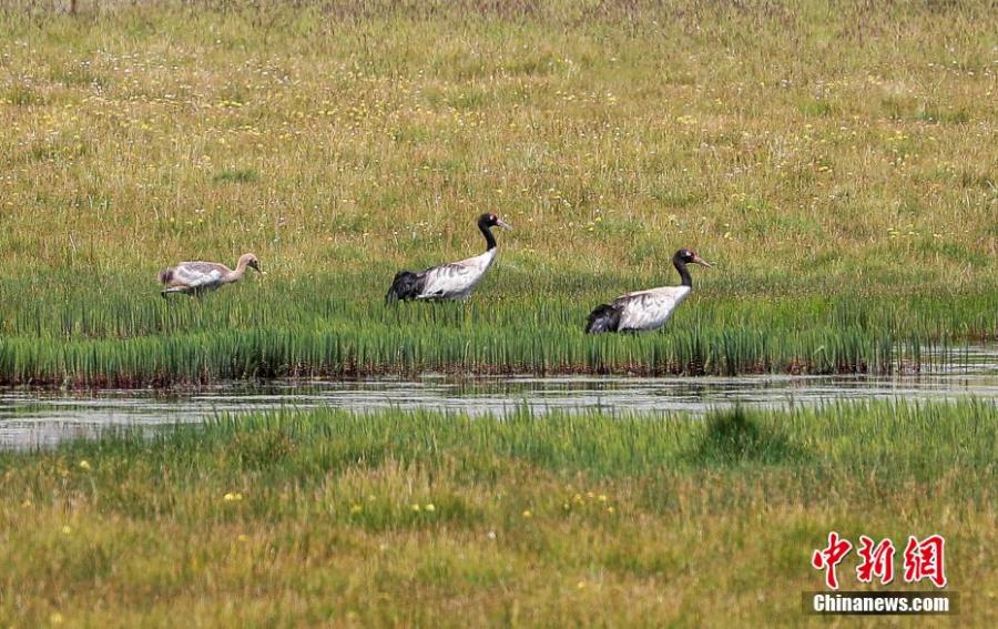 Black-necked cranes spotted in wetland park of Tibetan Plateau