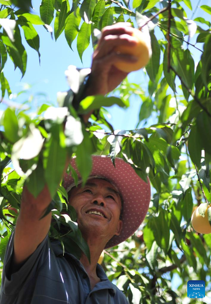 A villager harvests peaches in Banxi Village of Tonglin Town in Qiandongnan Miao and Dong Autonomous Prefecture, southwest China's Guizhou Province, Aug. 10, 2022. Villagers in Banxi Village are busying harvesting fruits such as peaches, pears and plums amid the harvest season. (Photo by Jiang Hongqi/Xinhua)