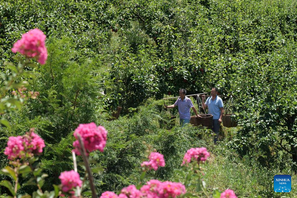 Villagers are on the way harvesting fruits in Banxi Village of Tonglin Town in Qiandongnan Miao and Dong Autonomous Prefecture, southwest China's Guizhou Province, Aug. 10, 2022. Villagers in Banxi Village are busying harvesting fruits such as peaches, pears and plums amid the harvest season. (Photo by Yang Yun/Xinhua)