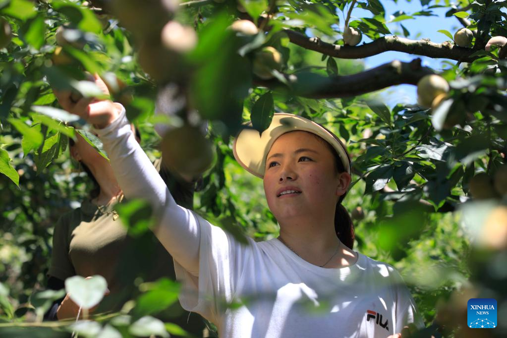 A villager harvests pears in Banxi Village of Tonglin Town in Qiandongnan Miao and Dong Autonomous Prefecture, southwest China's Guizhou Province, Aug. 10, 2022. Villagers in Banxi Village are busying harvesting fruits such as peaches, pears and plums amid the harvest season. (Photo by Luo Hui/Xinhua)
