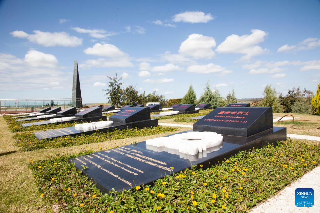 File photo taken on June 2, 2022 shows the graves of Chinese engineers and workers in the TAZARA Memorial Park in Chongwe, Lusaka Province, Zambia. Zambia on Aug. 10 commissioned a memorial park built in honor of Chinese nationals who died during the construction of the Tanzania Zambia Railway Authority (TAZARA) railway line in the 1970s. (Xinhua/Martin Mbangweta)