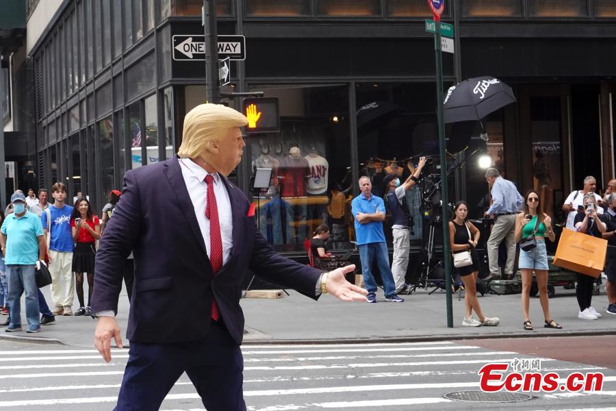 A protester wears a former U.S. President Donald Trump mask protests outside Trump Tower in New York City, U.S., August 10, 2022 after former U.S. President Donald Trump said that FBI agents raided his Mar-a-Lago Palm Beach home. (Photo: China News Service/Liao Pan)