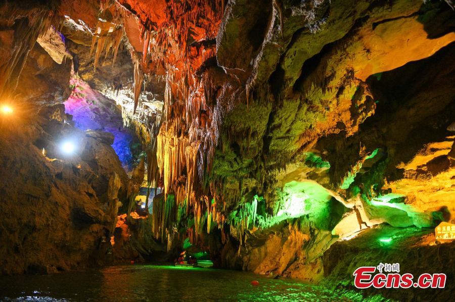 Colored lights illuminate the geological formations at the Benxi Water Cave, a large-scale underground karst, in Benxi, northeast China's Liaoning Province, Aug. 10, 2022. (Photo: China News Service/Yu Haiyang)