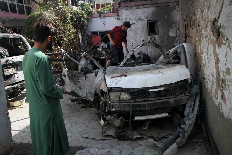 Photo taken on Sept. 2, 2021 shows damaged vehicles at the site of the U.S. airstrike in Kabul, capital of Afghanistan. (Photo by Saifurahman Safi/Xinhua)