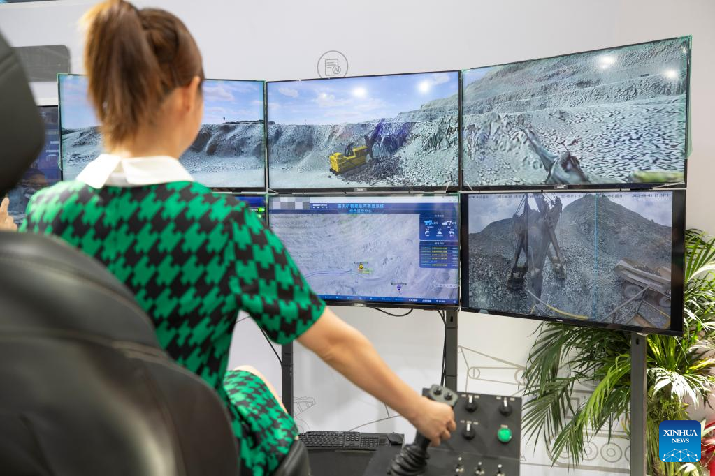 A visitor experiences a 5G remote mining equipment at the 2022 World 5G Convention in Harbin, capital of northeast China's Heilongjiang Province, Aug. 11, 2022. China has some 1.85 million 5G base stations and more than 450 million 5G end users, both accounting for over 60 percent of the global total. (Xinhua/Zhang Tao)