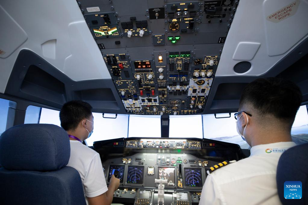 Visitors experience a 5G flight simulator at the 2022 World 5G Convention in Harbin, capital of northeast China's Heilongjiang Province, Aug. 11, 2022. China has some 1.85 million 5G base stations and more than 450 million 5G end users, both accounting for over 60 percent of the global total. (Xinhua/Zhang Tao)