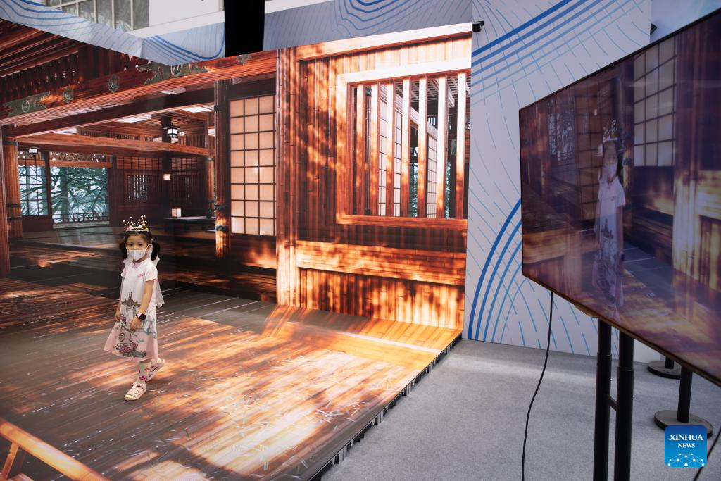 A kid experiences virtual filmmaking supported by 5G technology at the 2022 World 5G Convention in Harbin, capital of northeast China's Heilongjiang Province, Aug. 11, 2022. China has some 1.85 million 5G base stations and more than 450 million 5G end users, both accounting for over 60 percent of the global total. (Xinhua/Zhang Tao)