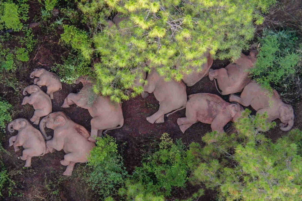 Wandering elephants take a rest after arriving at Yimen county, Yuxi, on June 13 last year. The herd returned to its habitat in Xishuangbanna after roaming for 1,300 kilometers in about 110 days. XINHUA