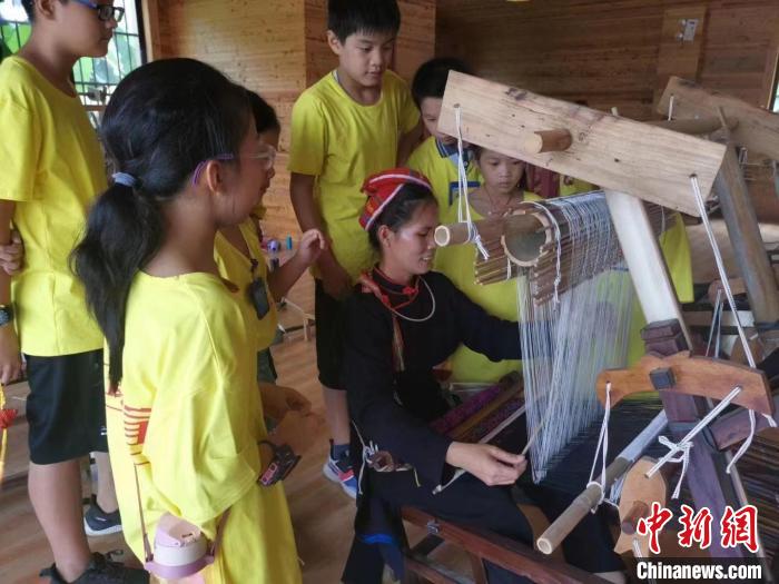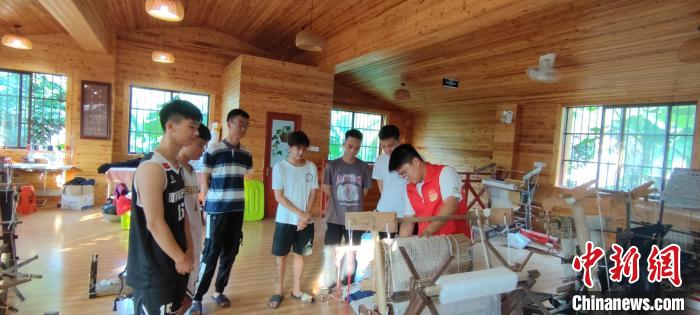 Li Changlong (1st R) shows college students in Shuangmeng village, Jinlong township, Chongzuo city of south China's Guangxi Zhuang Autonomous Region how to operate a loom. (Chinanews.com/Pang Wanwen)