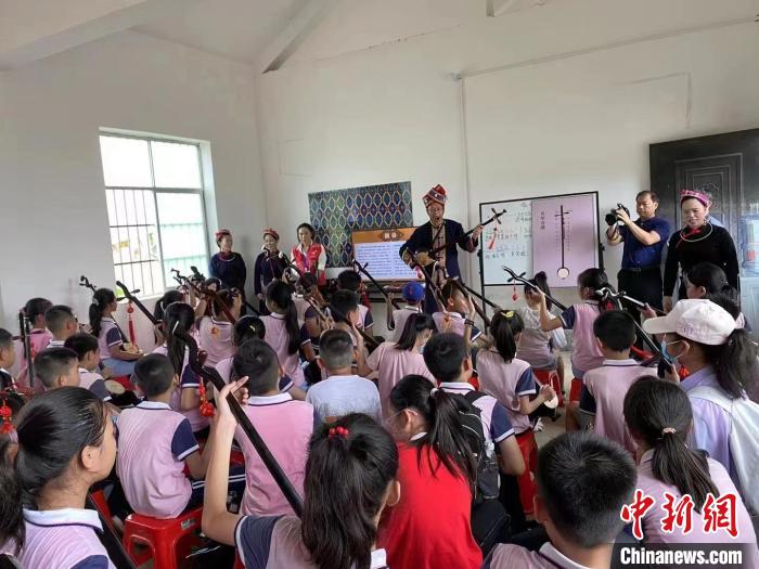 Senior villagers who can play Tianqin, a traditional musical instrument of the Zhuang ethnic group, teach students how to play Tianqin in Shuangmeng village, Jinlong township, Chongzuo city of south China's Guangxi Zhuang Autonomous Region. (Photo/Pang Wanwen)