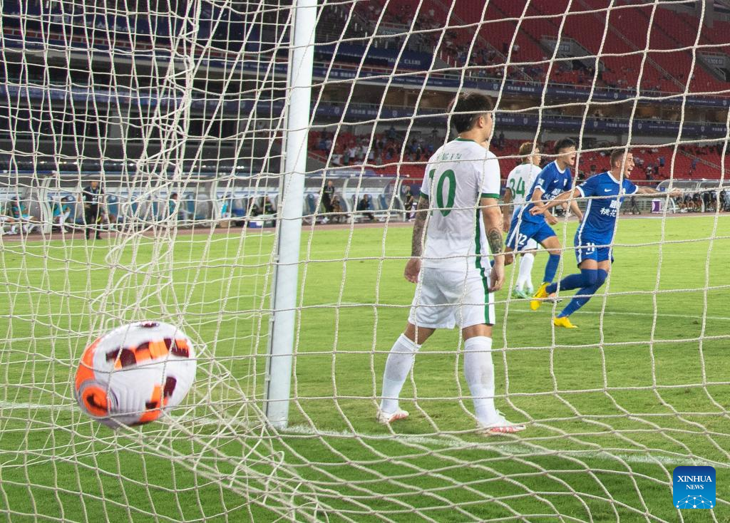 Davidson (1st R) of Wuhan Three Towns scores a goal during a 2022 season Chinese Football Association Super League (CSL) match between Wuhan Three Towns and Beijing Guoan in Wuhan, central China's Hubei Province, Aug. 12, 2022. (Xinhua/Xiao Yijiu)