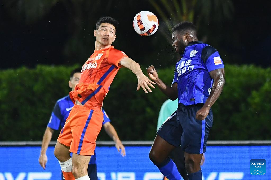 Oscar Maritu (R) of Cangzhou Mighty Lions vies for a header during a 2022 season Chinese Football Association Super League (CSL) match between Shandong Taishan and Cangzhou Mighty Lions in Haikou, south China's Hainan Province, Aug. 12, 2022. (Xinhua/Hu Zhixuan)