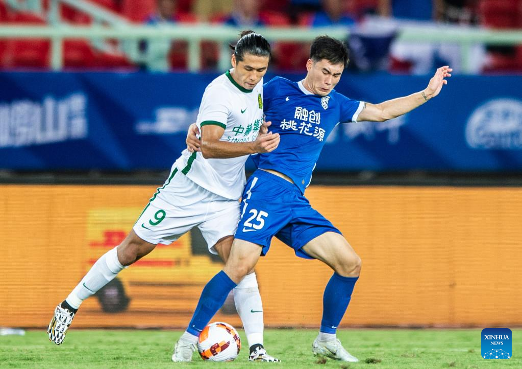 Liu Yiming (top) of Wuhan Three Towns vies with Cao Yongjing of Beijing Guoan during a 2022 season Chinese Football Association Super League (CSL) match between Wuhan Three Towns and Beijing Guoan in Wuhan, central China's Hubei Province, Aug. 12, 2022. (Xinhua/Xiao Yijiu)