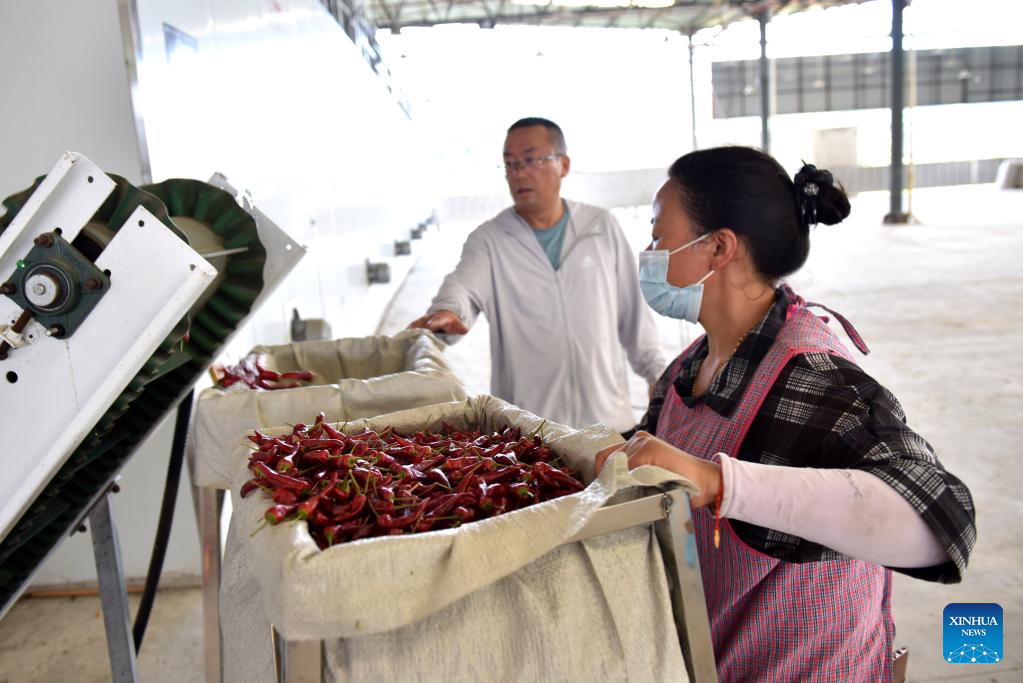Workers work at a chili peppers processing factory in Wantanhe Township, Longli County, southwest China's Guizhou Province, Aug. 11, 2022. (Photo by Long Yi/Xinhua)
