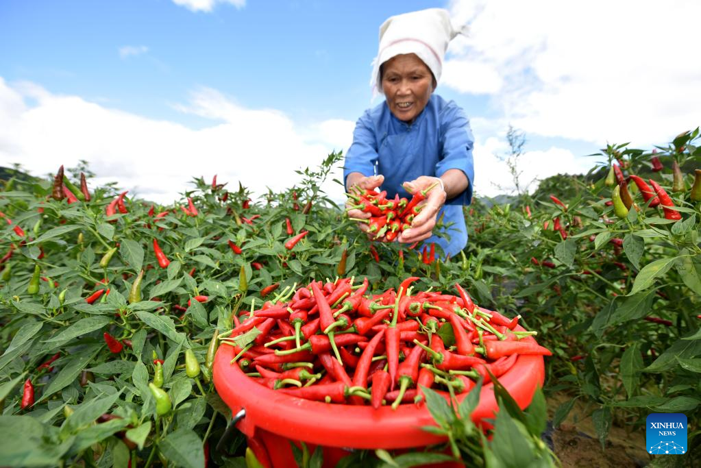 A farmer harvests chili peppers at a chili planting base in Wantanhe Township, Longli County, southwest China's Guizhou Province, Aug. 12, 2022. (Photo by Long Yi/Xinhua)