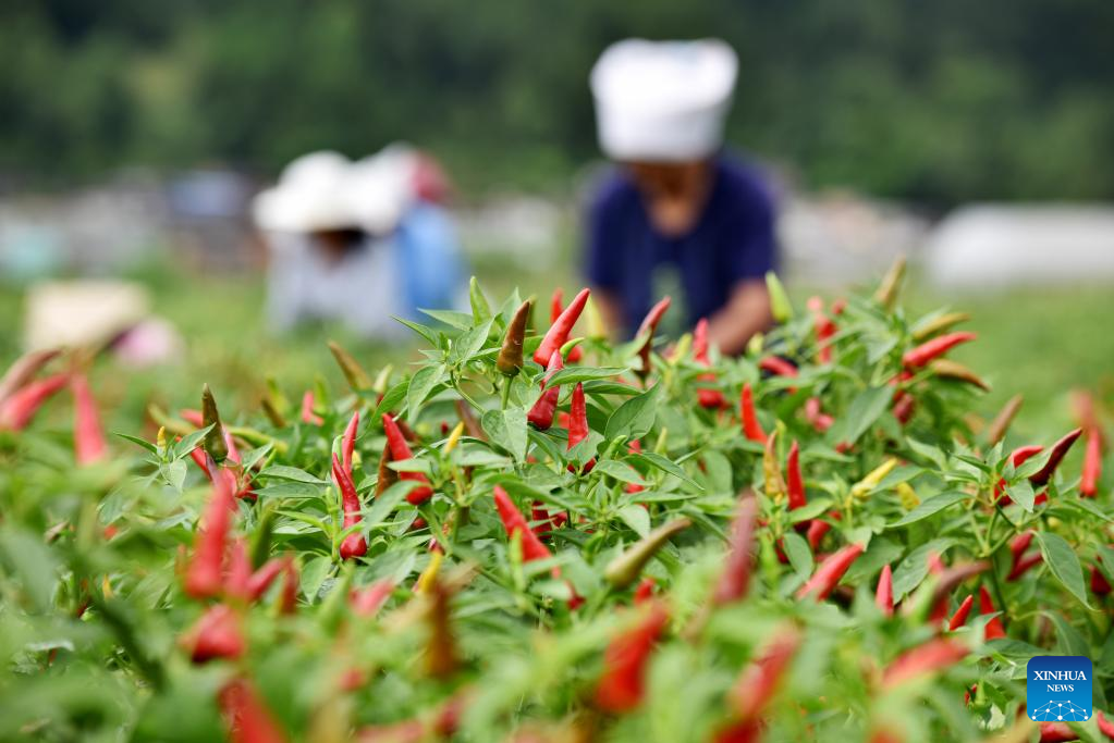 Farmers harvest chili peppers at a chili planting base in Wantanhe Township, Longli County, southwest China's Guizhou Province, Aug. 12, 2022. (Photo by Long Yi/Xinhua)