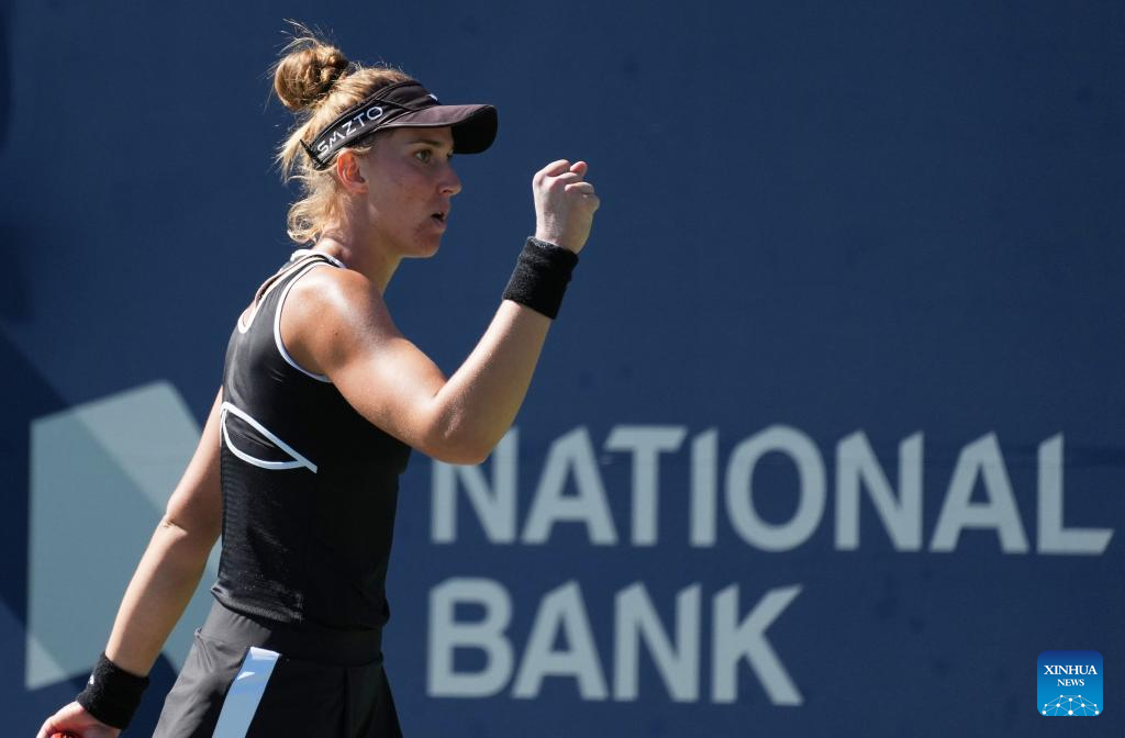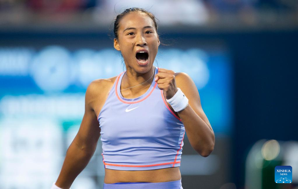 Zheng Qinwen of China celebrates scoring during the third round of women's singles match between Zheng Qinwen of China and Bianca Andreescu of Canada at the 2022 National Bank Open tennis tournament in Toronto, Canada, on Aug. 11, 2022. (Photo by Zou Zheng/Xinhua)