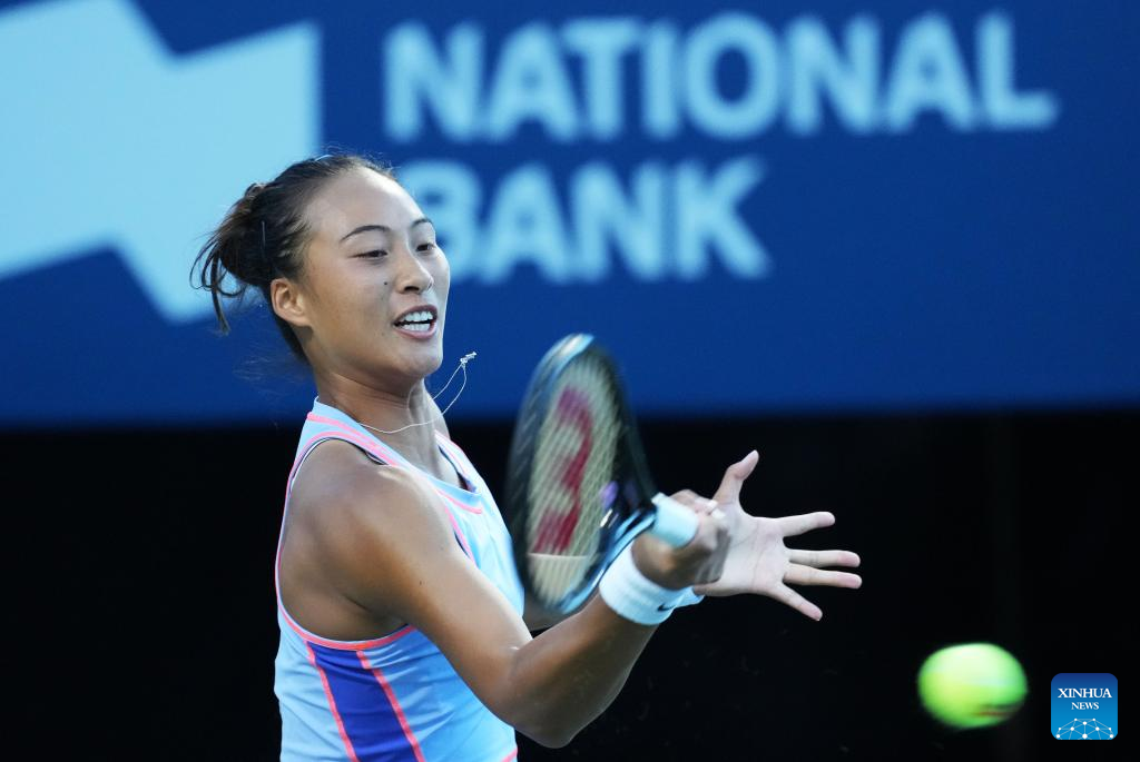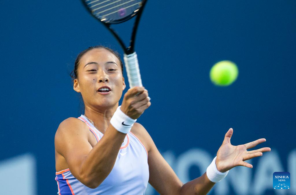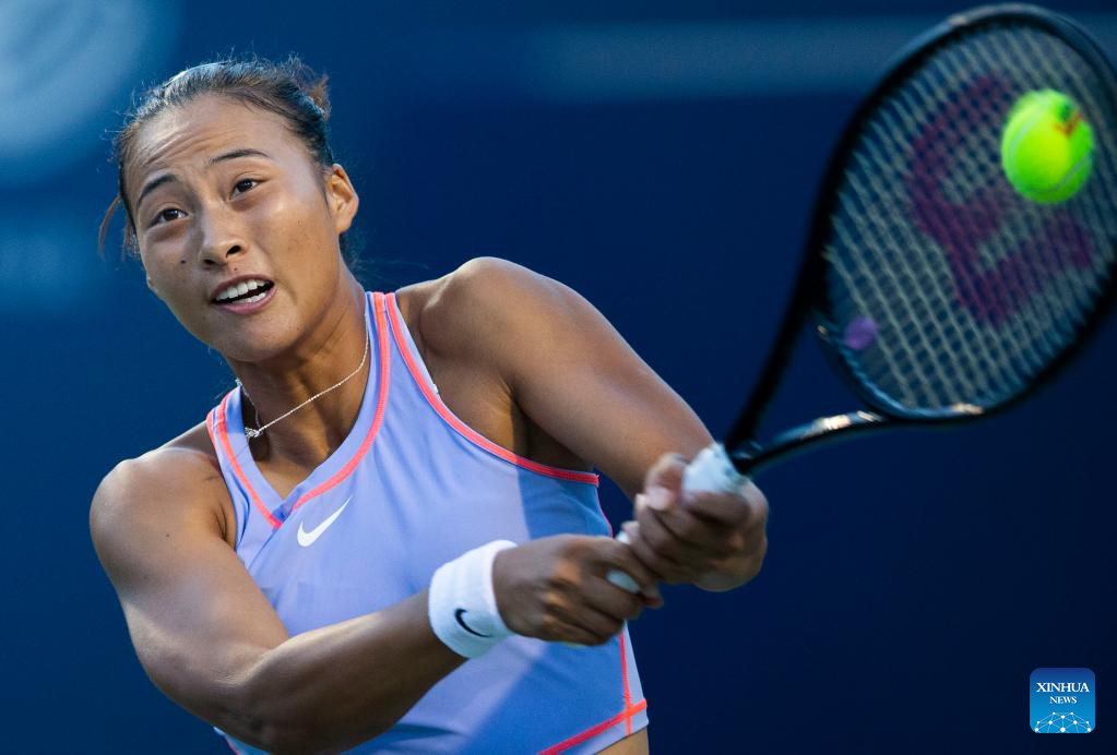Zheng Qinwen of China returns the ball during the third round of women's singles match between Zheng Qinwen of China and Bianca Andreescu of Canada at the 2022 National Bank Open tennis tournament in Toronto, Canada, on Aug. 11, 2022. (Photo by Zou Zheng/Xinhua)