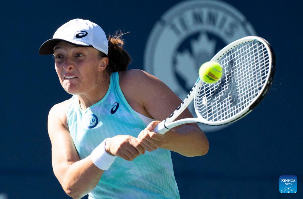 Iga Swiatek of Poland returns the ball during the third round of women's singles match between Iga Swiatek of Poland and Beatriz Haddad Maia of Brazil at the 2022 National Bank Open tennis tournament in Toronto, Canada, on Aug. 11, 2022. (Photo by Zou Zheng/Xinhua)