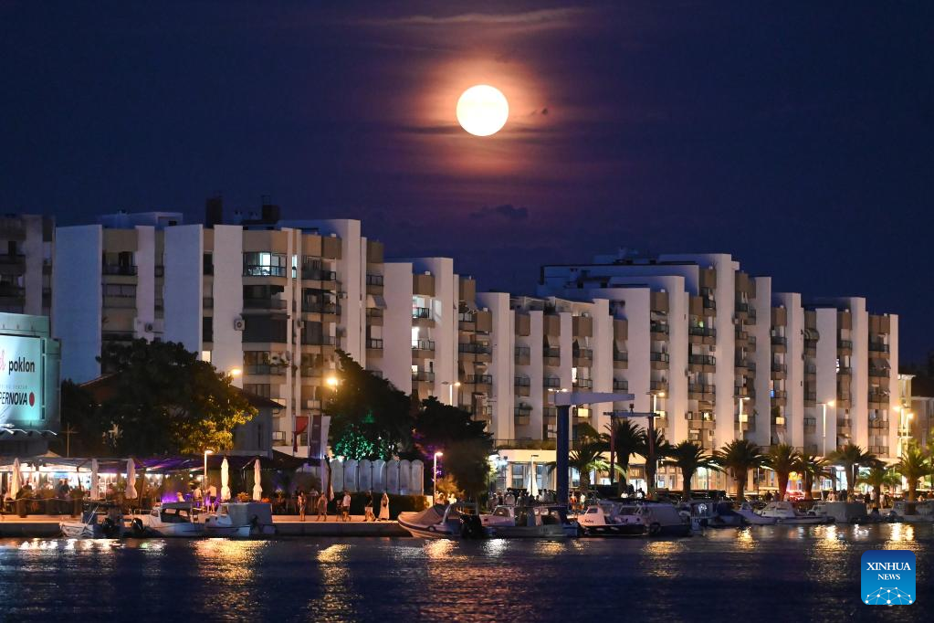 A full moon rises in the sky above Zadar, Croatia, Aug. 11, 2022. (Photo by Dino Stanin/PIXSELL via Xinhua)