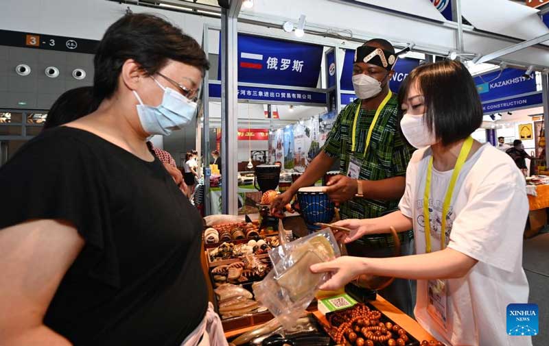 Visitors learn about specialties exhibited at the Ghana booth during the sixth Silk Road International Exposition in Xi'an, northwest China's Shaanxi Province, Aug. 14, 2022.