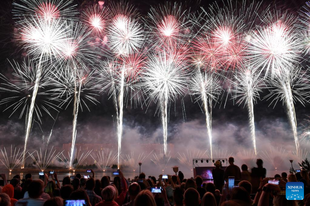 People watch fireworks during the Rostec fireworks festival in Moscow, Russia, on Aug. 14, 2022. (Photo by Alexander Zemlianichenko Jr/Xinhua)