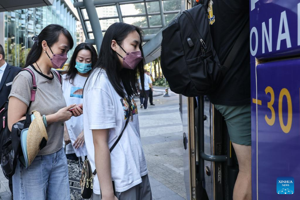 Stranded tourists take a coach to Haikou Meilan International Airport in Haikou, south China's Hainan Province, Aug. 14, 2022.