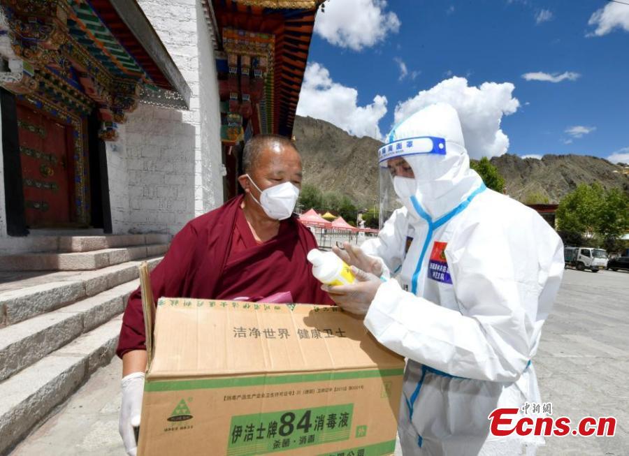 A volunteer delivers epidemic prevention supplies at a monastery in Lhasa, southwest China's Tibet Autonomous Region, Aug. 14, 2022. (Photo: China News Service/Li Lin)