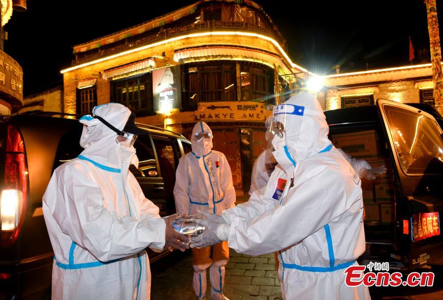 A volunteer delivers epidemic prevention supplies to medical staff in Lhasa, southwest China's Tibet Autonomous Region, Aug. 14, 2022. (Photo: China News Service/Li Lin)