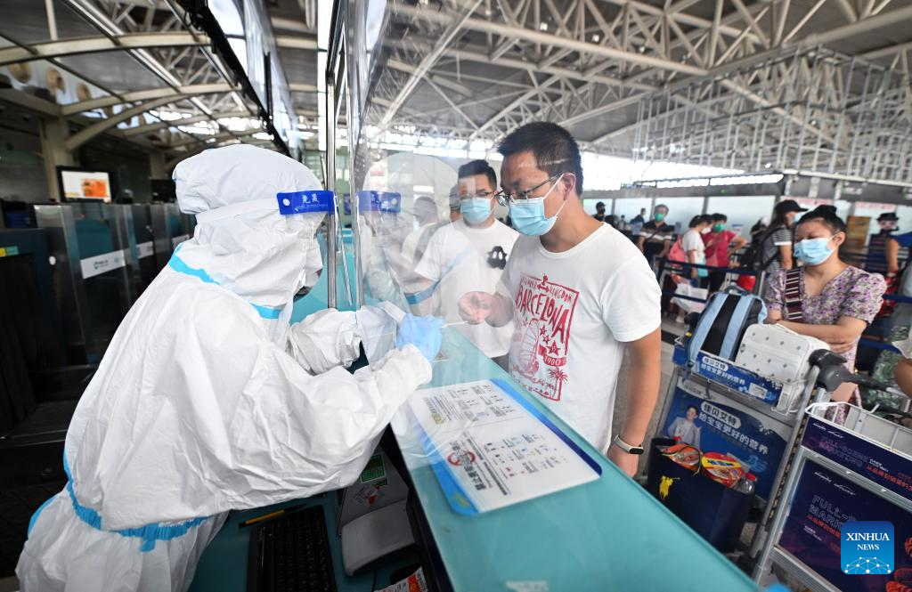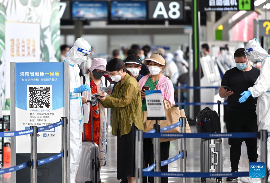 Passengers check in at the Sanya Phoenix International Airport in Sanya, south China's Hainan Province, Aug. 15, 2022. The commercial operation of domestic passenger flights have been gradually resumed at the Sanya Phoenix International Airport from Monday. (Xinhua/Guo Cheng)