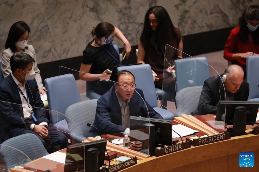 Zhang Jun (C, Front), China's permanent representative to the United Nations, speaks at a UN Security Council meeting on the situation in Yemen at the UN headquarters in New York, on Aug. 15, 2022. Zhang Jun on Monday called for fully implementing the truce agreement in Yemen, expanding the achievements of the truce and putting focus on improving the humanitarian situation. (Xinhua/Xie E)
