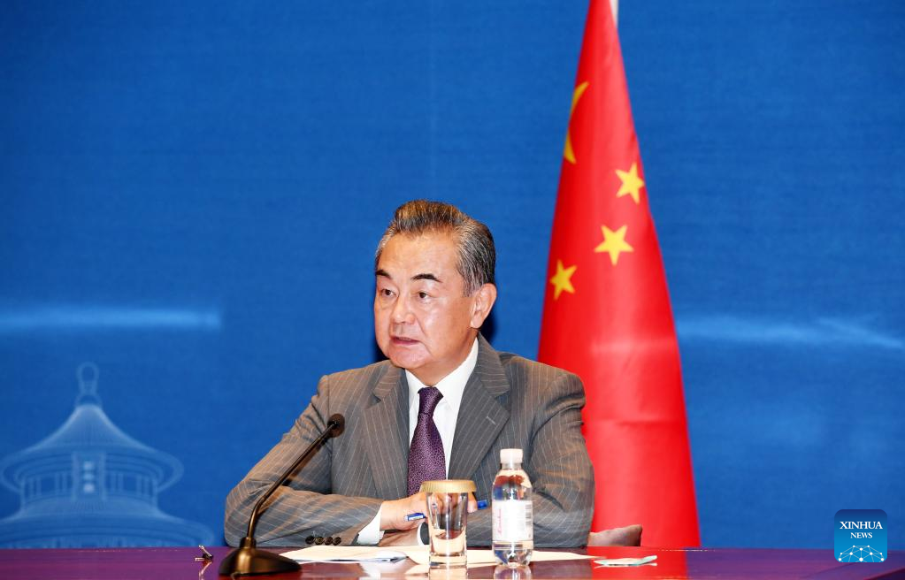 Chinese State Councilor and Foreign Minister Wang Yi meets with visiting diplomatic envoys of developing countries from Asia and Africa to the UN Office at Geneva via video link in Qingdao, east China's Shandong Province, Aug. 15, 2022. (Xinhua/Li Ziheng)