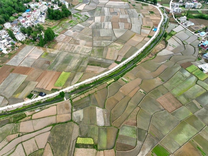 Photo taken in May 2022 shows a irrigation cannel running through the farmland in Sanxigou village, Jundian township, Fangxian county, Shiyan, central China's Hubei province. The cannel is connected to a local reservoir. In the recent years, the county has built a modern water network with water diversion, cannel expansion and water storage projects. (People's Daily Online/Zhang Qilong)