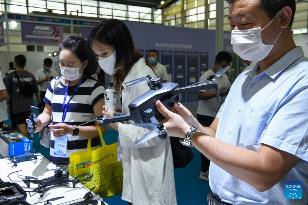 Visitors learn about drones at the 10th China Information Technology Expo in Shenzhen, south China's Guangdong Province, Aug. 16, 2022. With an exhibition area of around 100,000 square meters, the 10th China Information Technology Expo kicked off in Shenzhen on Tuesday, attracting the participation of over 1,400 enterprises. (Xinhua/Liang Xu)