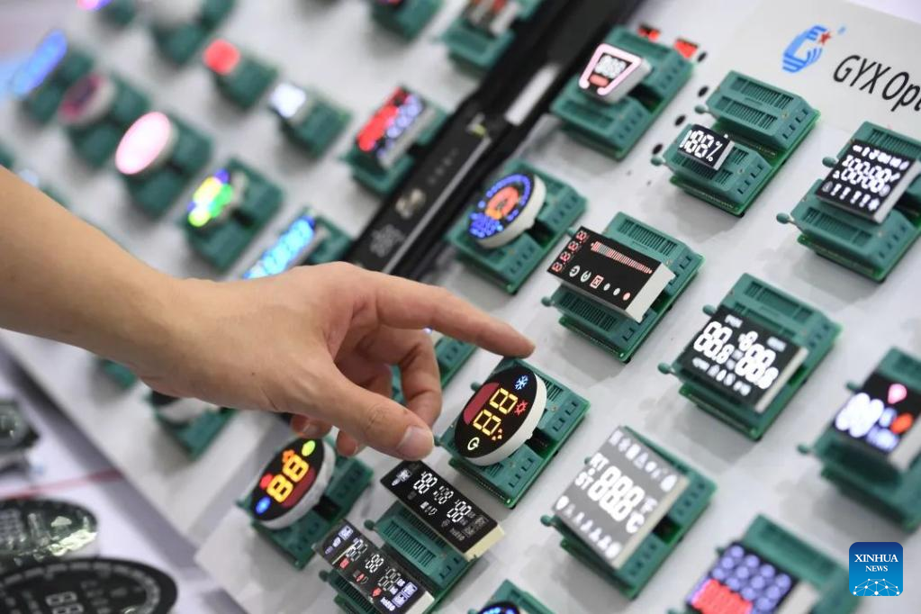 A visitor touches nixie tube screens at the 10th China Information Technology Expo in Shenzhen, south China's Guangdong Province, Aug. 16, 2022. With an exhibition area of around 100,000 square meters, the 10th China Information Technology Expo kicked off in Shenzhen on Tuesday, attracting the participation of over 1,400 enterprises. (Xinhua/Mao Siqian)