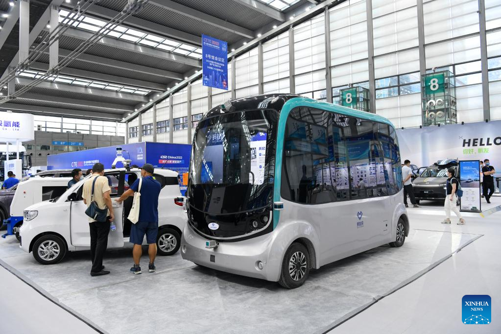 Visitors learn about driverless vehicles at the 10th China Information Technology Expo in Shenzhen, south China's Guangdong Province, Aug. 16, 2022. With an exhibition area of around 100,000 square meters, the 10th China Information Technology Expo kicked off in Shenzhen on Tuesday, attracting the participation of over 1,400 enterprises. (Xinhua/Liang Xu)