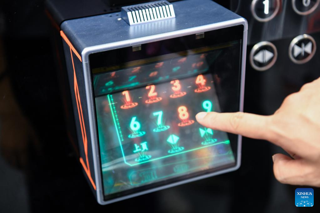A visitor tries non-contact air buttons for elevator at the 10th China Information Technology Expo in Shenzhen, south China's Guangdong Province, Aug. 16, 2022. With an exhibition area of around 100,000 square meters, the 10th China Information Technology Expo kicked off in Shenzhen on Tuesday, attracting the participation of over 1,400 enterprises. (Xinhua/Liang Xu)