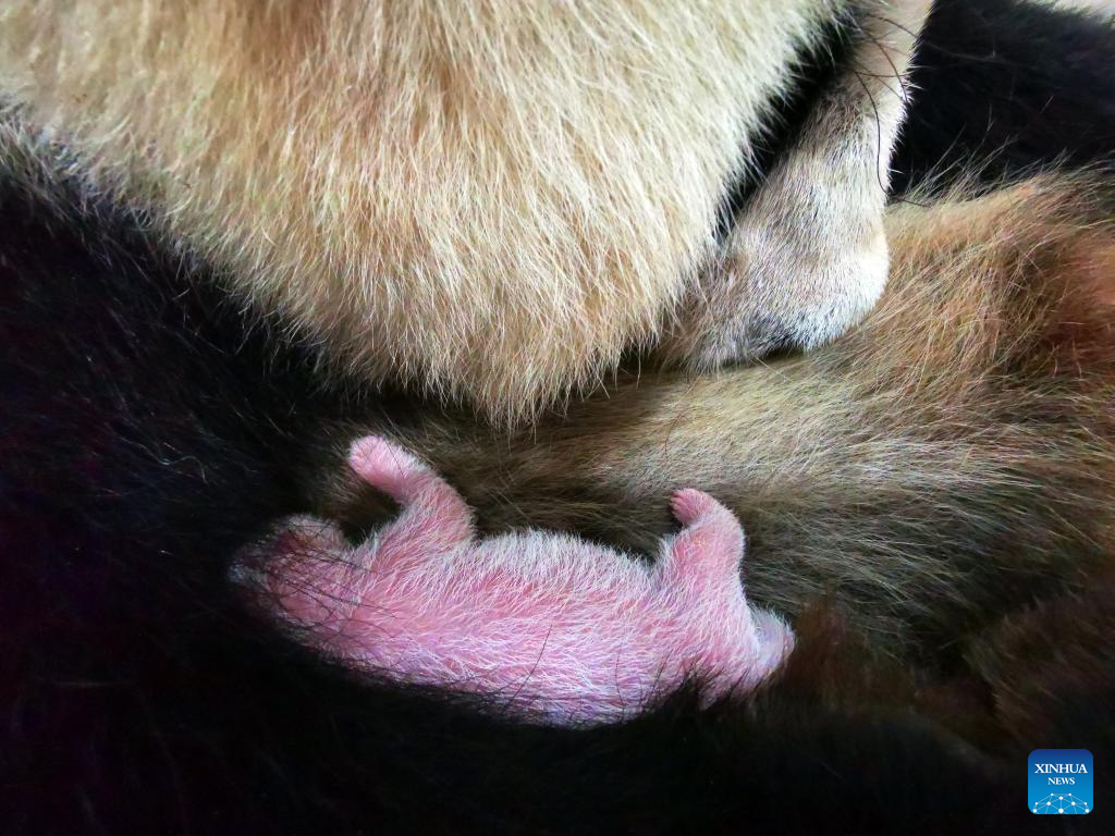 Cuicui, a 16-year-old panda, gave birth to the cub at the Wolong Shenshuping panda base at 9:39 p.m. on Aug. 5, breaking the previous birth weight record of 249 grams held by a panda born in 2021. (Xinhua/Shen Bohan)