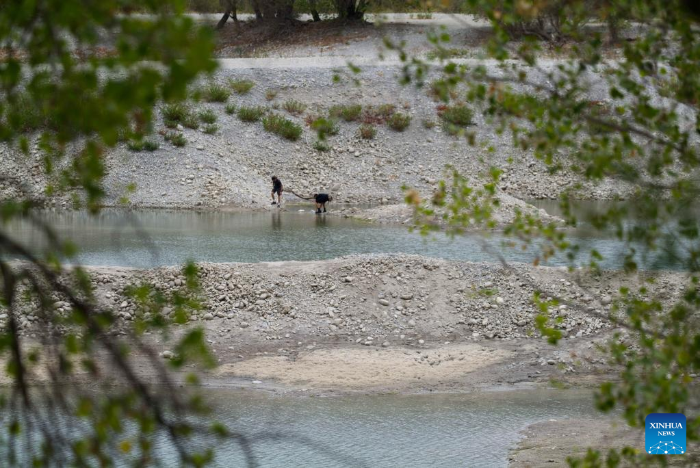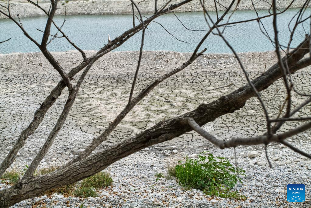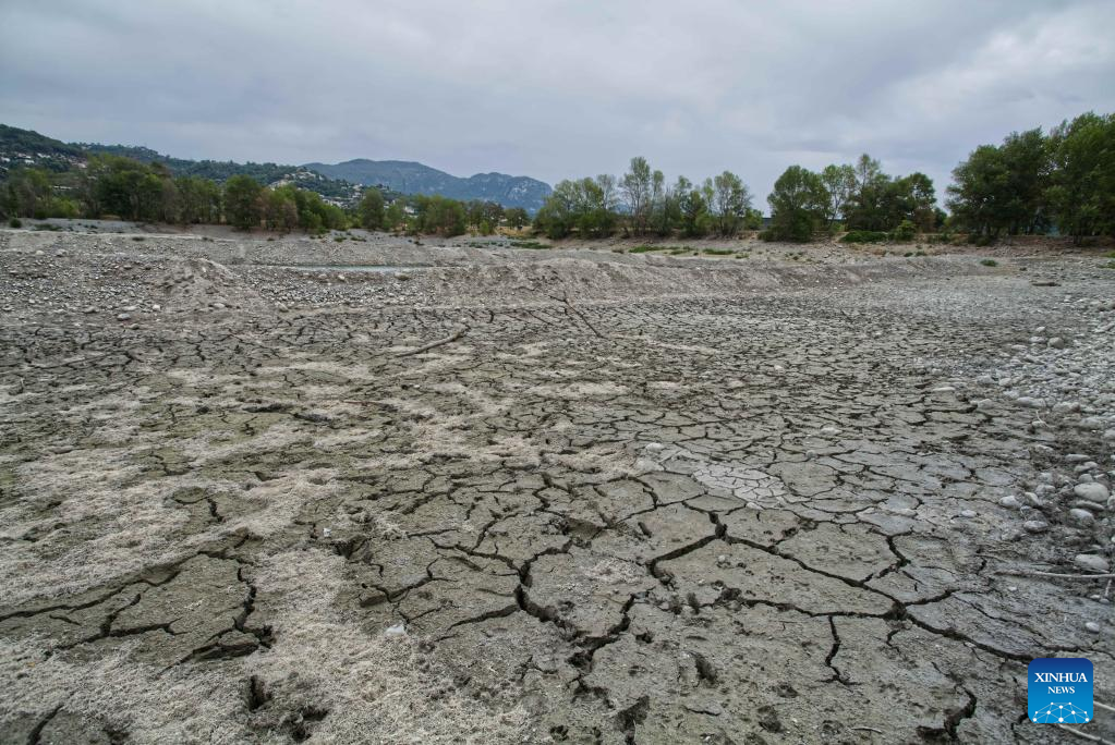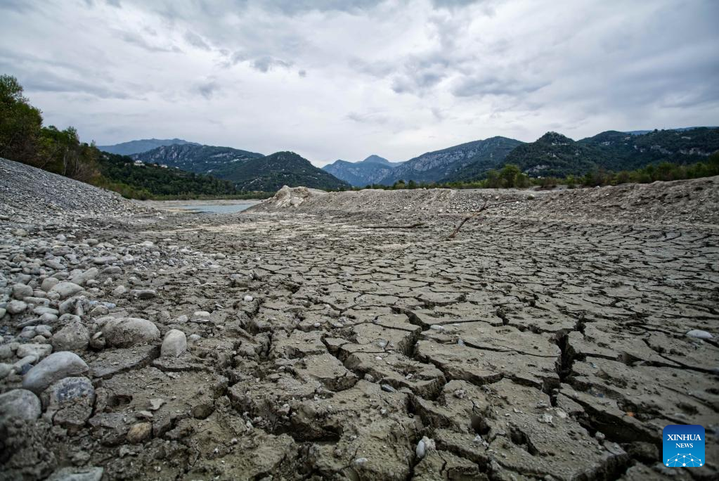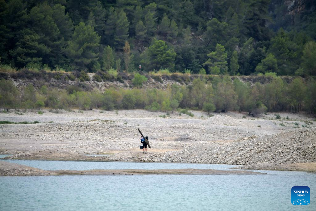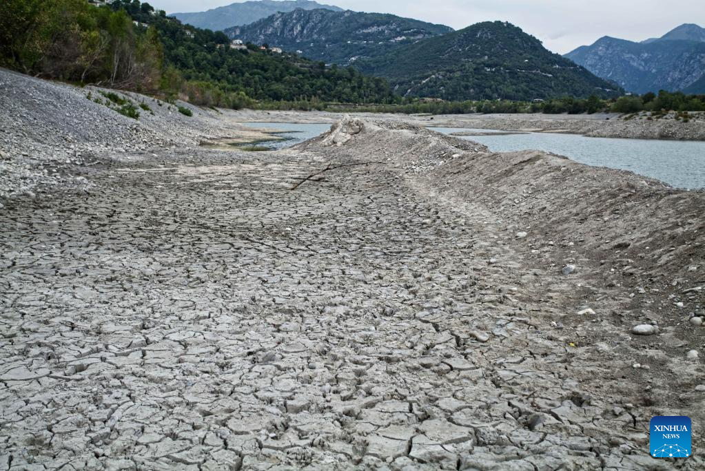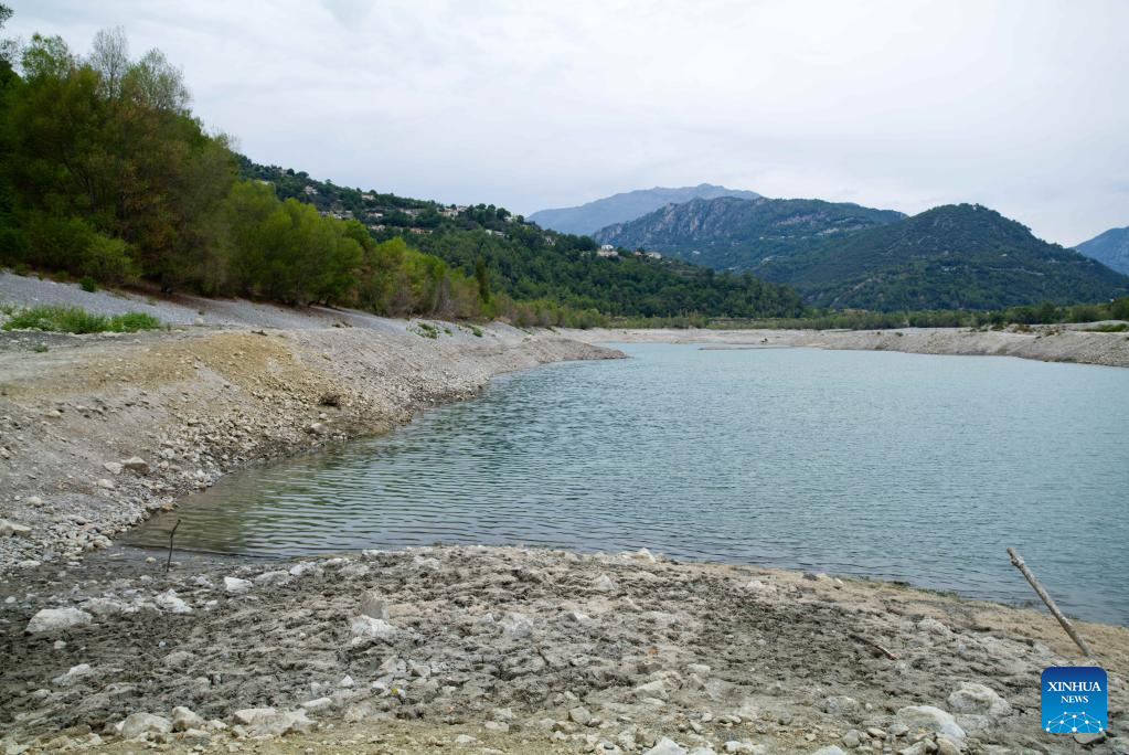 Photo taken on Aug. 17, 2022 shows a view of the artificial Broc lake near Nice, Alpes-Maritimes, southern France. In July, France received "a total of 9.7 millimeters of rainfall on average", making it the driest July since 1959, as well as the fourth hottest month since 1900, Le Figaro quoted meteorologist Cyrielle Duchesne as saying. (Photo by Serge Haouzi/Xinhua)