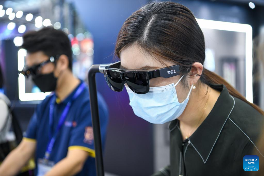 A visitor puts on a pair of smart glasses at the 10th China Information Technology Expo in Shenzhen, south China's Guangdong Province, Aug. 17, 2022. (Xinhua/Liang Xu)