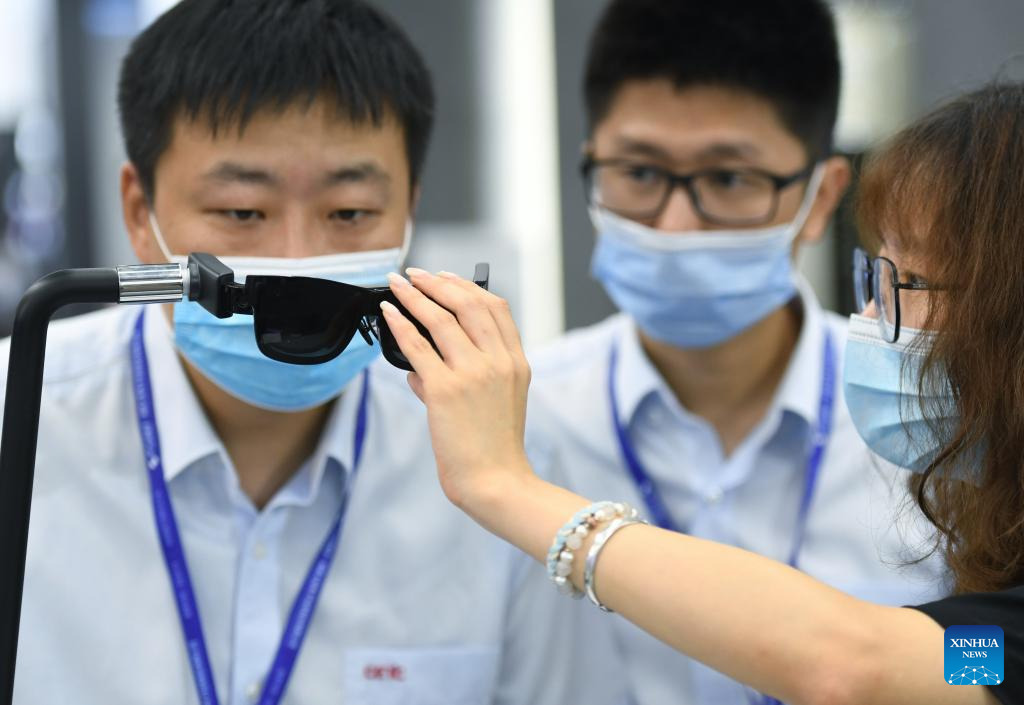 People watch a pair of XR (extended reality) glasses at the 10th China Information Technology Expo in Shenzhen, south China's Guangdong Province, Aug. 16, 2022. (Xinhua/Mao Siqian)