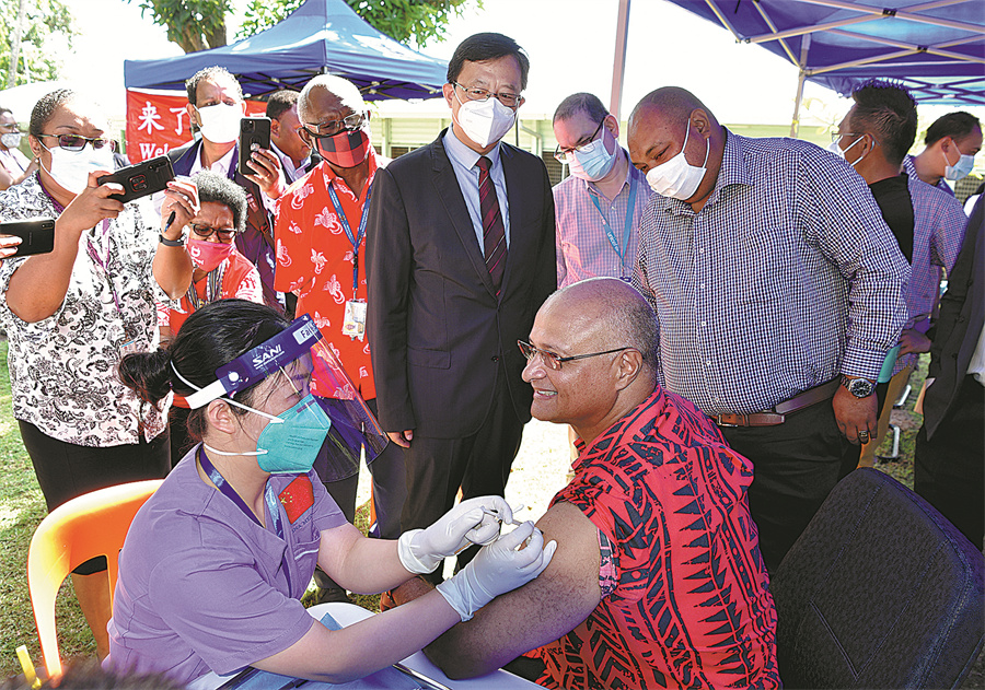 Papua New Guinea's forestry minister receives a COVID-19 vaccination provided by a Chinese medical team in Port Moresby, the country's capital, on July 14 last year. XINHUA
