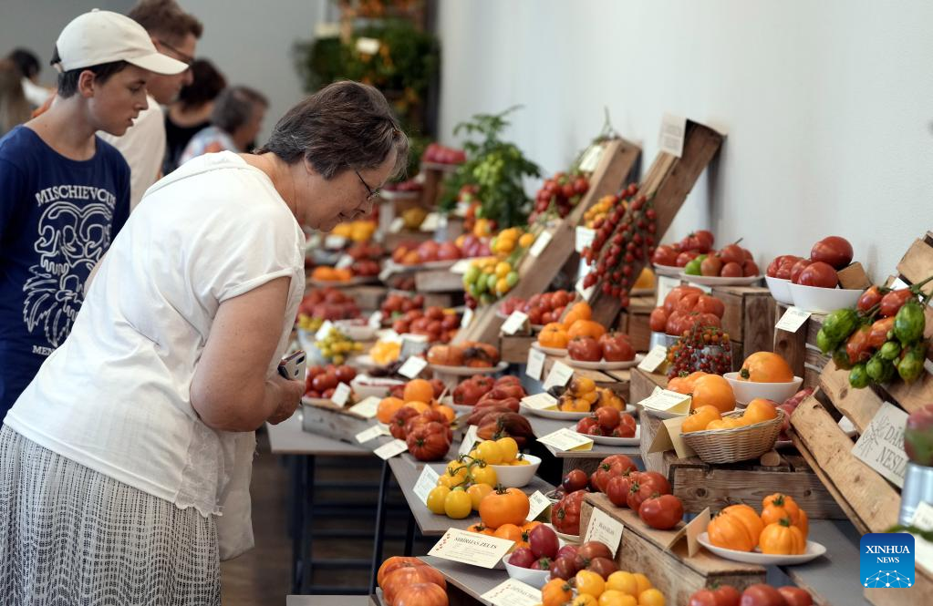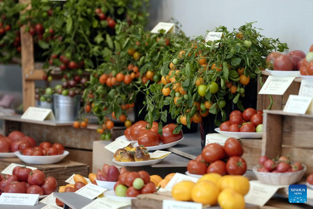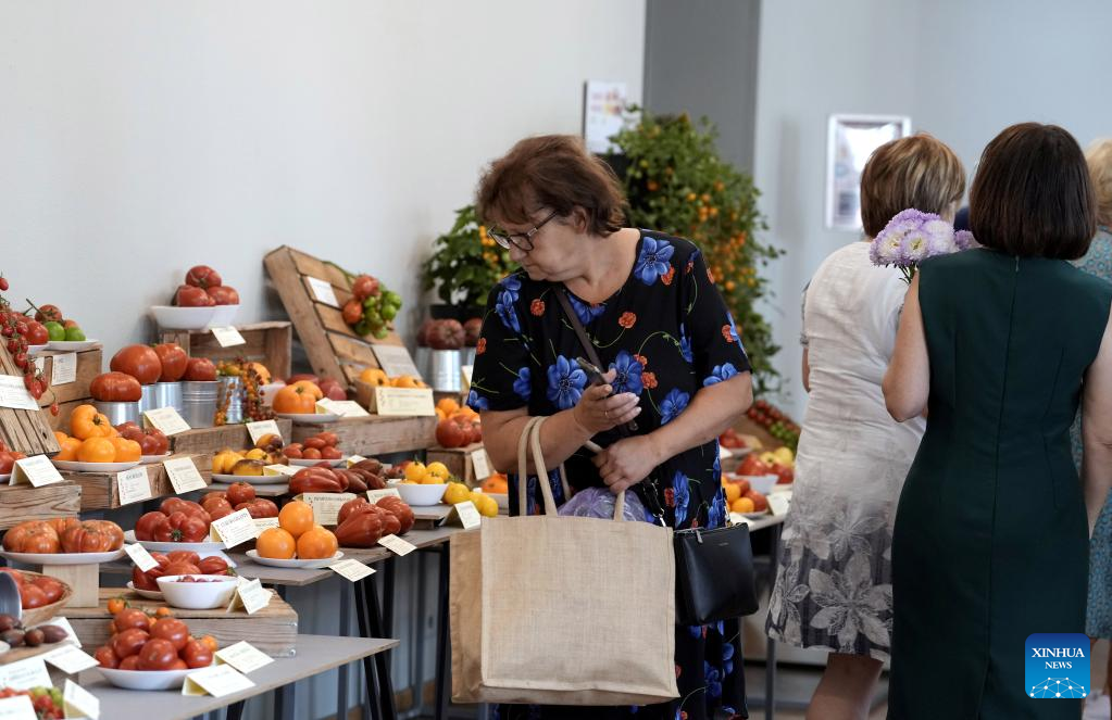 People visit the Tomatoes 2022 exhibition in Latvian Museum of Natural History in Riga, Latvia, Aug. 17, 2022. The exhibition kicked off on Wednesday and will last until Aug. 21. More than 300 different varieties of tomatoes are on display. (Photo by Edijs Palens/Xinhua)