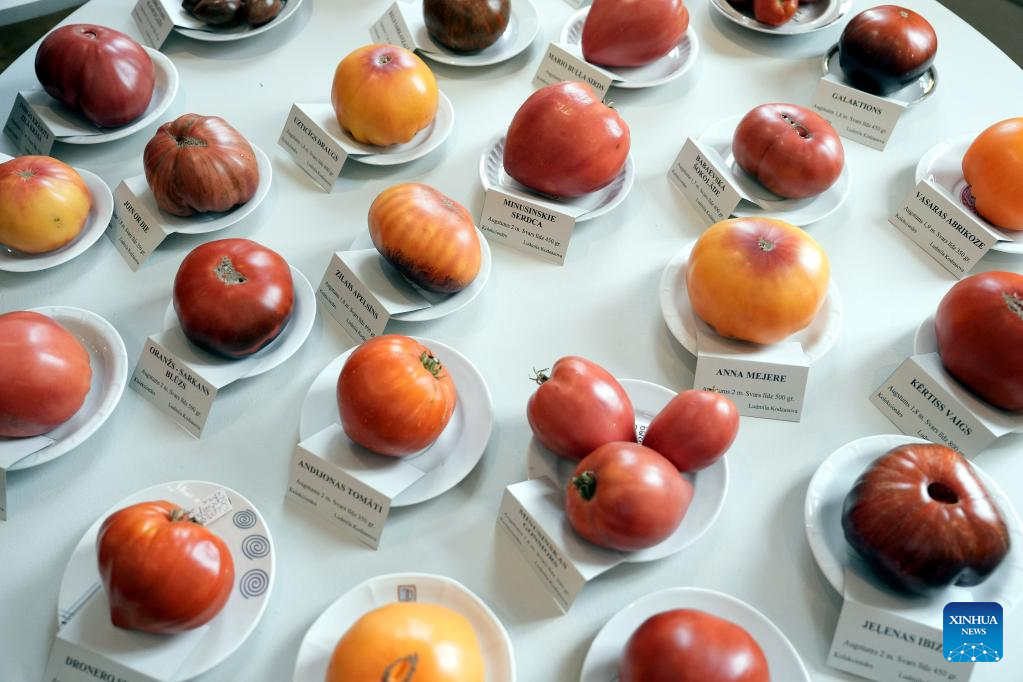 Tomatoes of different varieties are on display during the Tomatoes 2022 exhibition in Latvian Museum of Natural History in Riga, Latvia, Aug. 17, 2022. The exhibition kicked off on Wednesday and will last until Aug. 21. More than 300 different varieties of tomatoes are on display. (Photo by Edijs Palens/Xinhua)
