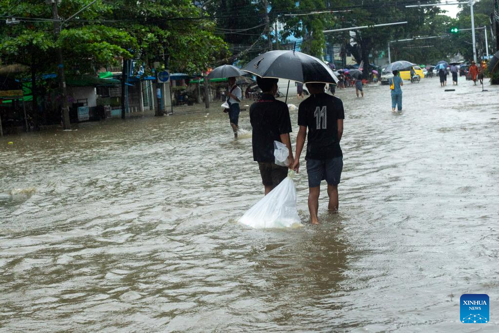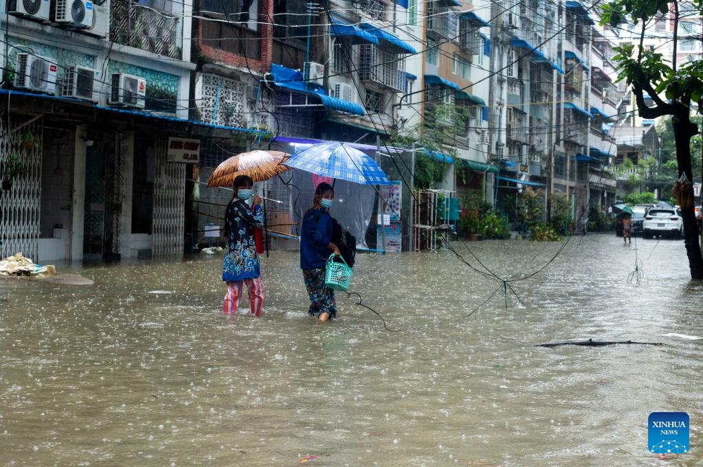 People wade through a flooded street after heavy rains in Yangon, Myanmar, Aug. 17, 2022. (Photo by Myo Kyaw Soe/Xinhua)