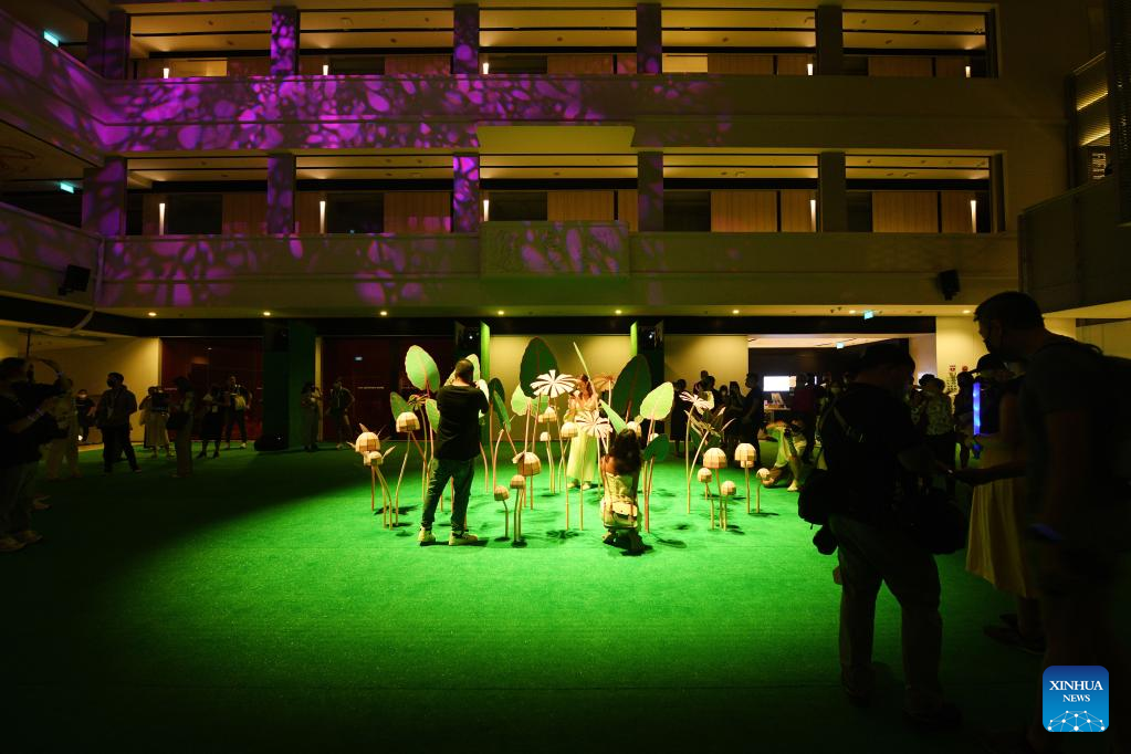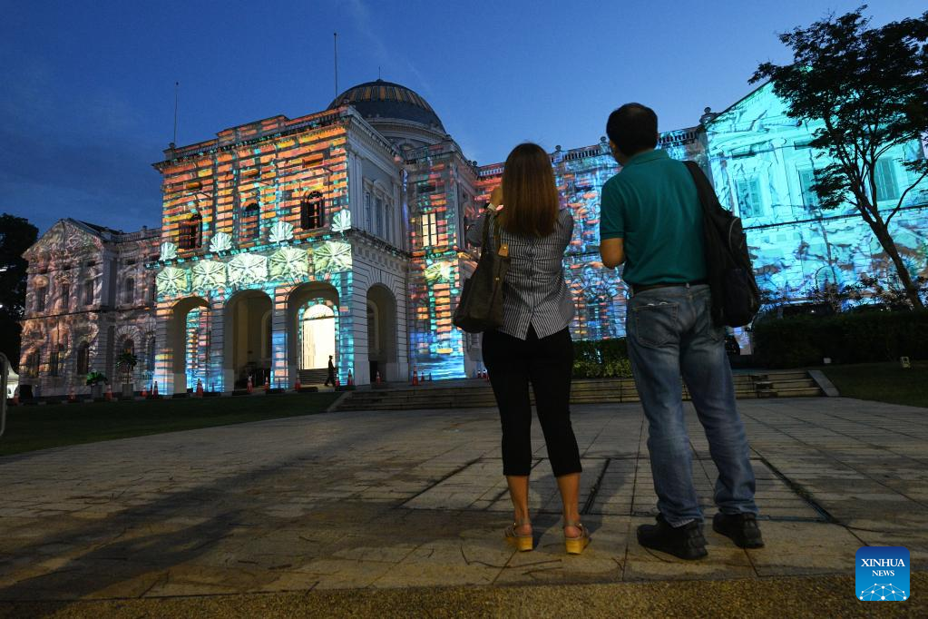 A visitor views light installations during the media preview of the Singapore Night Festival in Singapore on Aug. 17, 2022. (Photo by Then Chih Wey/Xinhua)