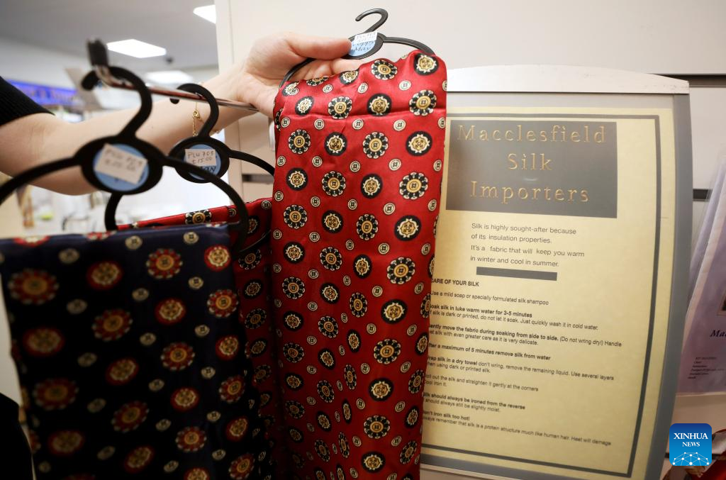 Photo taken on Aug. 12, 2022 shows a silk product in a souvenir shop in Macclesfield, Britain. The town of Macclesfield in northwest England was dubbed the "silk capital of England" in the 18th century, and now local entrepreneurs and artists are trying to keep this heritage alive. (Xinhua/Li Ying)