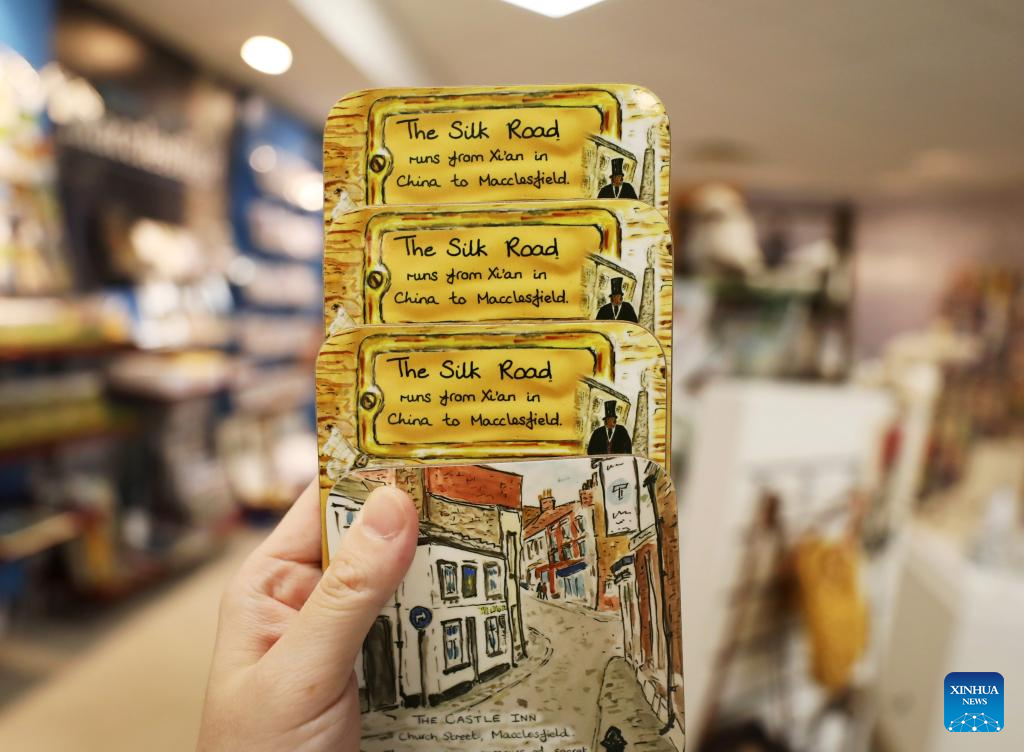 Photo taken on Aug. 12, 2022 shows a coaster in a souvenir shop in Macclesfield, Britain. The town of Macclesfield in northwest England was dubbed the "silk capital of England" in the 18th century, and now local entrepreneurs and artists are trying to keep this heritage alive. (Xinhua/Li Ying)